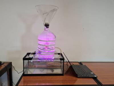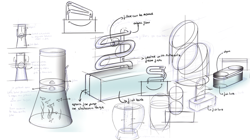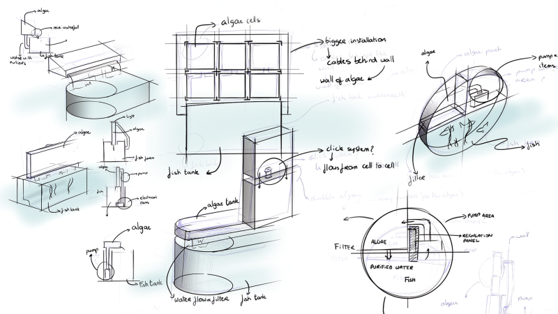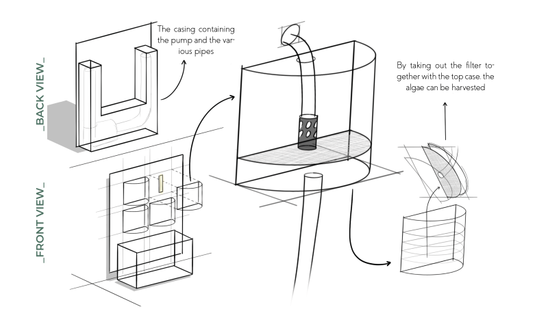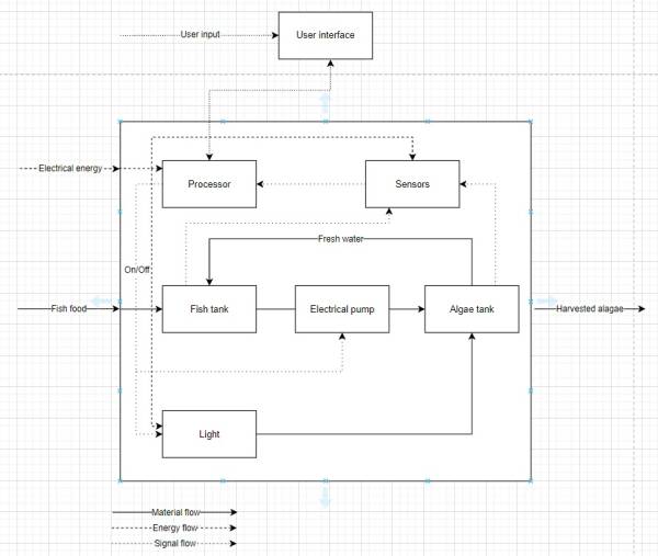 The prototype consists of two glass tanks, connected with pipes to create a well-functioning system. One of the tanks is used for algae and another one is for fish. The fish tank is equipped with pump and two sensors: water level and temperature. The pump is connected to the pipe which goes to the algae tank. The algae tank is illuminated with LEDs and equipped with filter preventing the unnecessary material to get through. From there, another pipe leads back to the fish aquarium, creating a circulation for water.