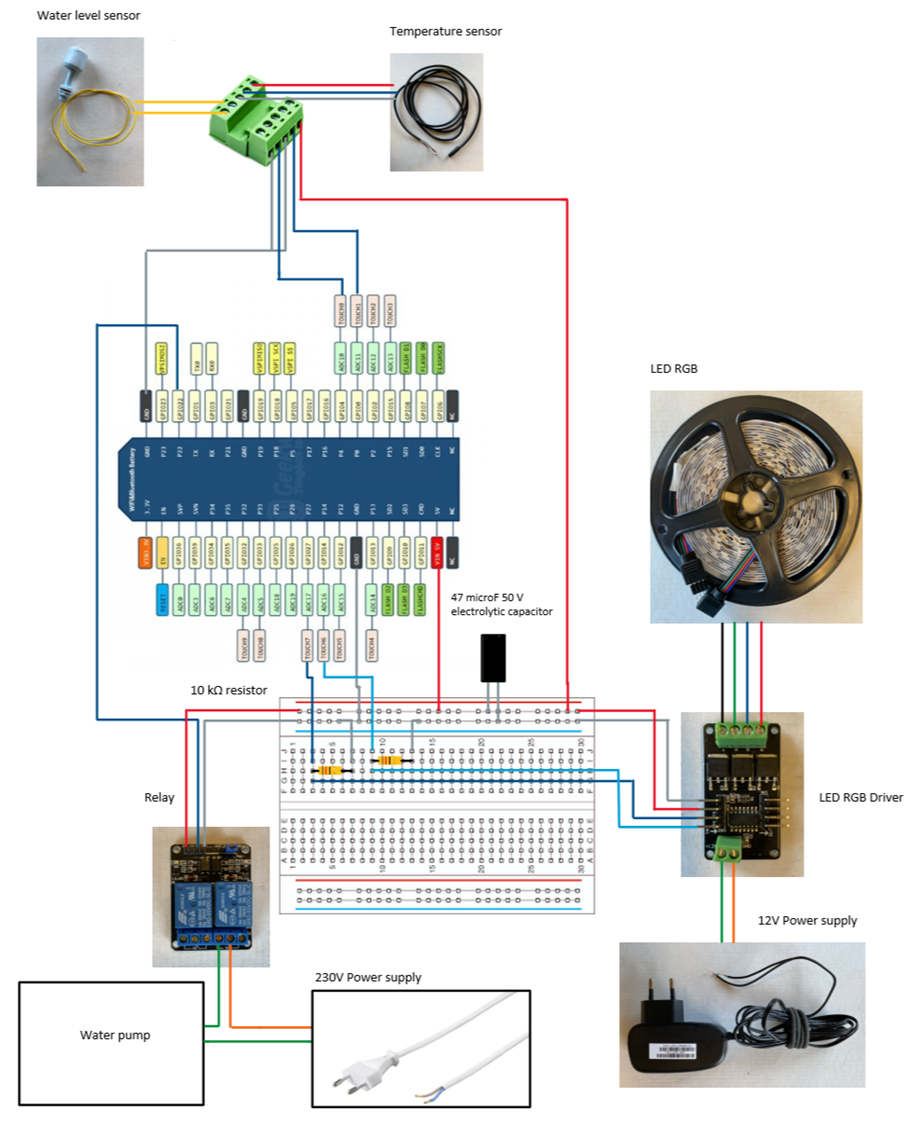 Compared to the preliminary circuit diagram, the connection between the relay and the power supply for the pump and the LED has changed significantly. Since the pump received cannot be operated with 12V as initially planned, but now requires 230V, the light and pump can no longer be operated with the same voltage source. For this reason, it no longer makes sense to control the LED using the relay. However, as the LED RGB driver can also be controlled directly via signals using the microcontroller, this is not a major problem. The pump is still switched via the relay.