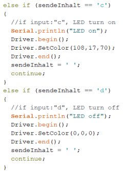The user is able to turn the light on and off inside and outside of the pump operation. In the code, this was realised by a simple additional “if” query (Figure 43). The RGB LED allows the exact colour tone of the light to be set. A blue-violet colour tone with the RGB code 108, 17, 70 was selected here. This colour tone favours the growth of algae.