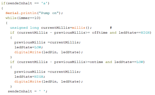As soon as the microcontroller receives the signal to switch on the pump, a while loop is started. As a result, the pump does not run all the time. This makes the system more efficient by saving electricity and balancing the water flow, which is affected by pipes of different thicknesses. It furthermore prevents the hopper from overflowing. To create a harmonious water flow, 3 seconds was chosen for the water flow time and 15 seconds pause (Figure 42). In the loop, it is also queried whether the user has made any further entries. If the user wants to switch off the pump, the while loop is interrupted with the command “break”.